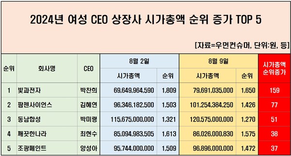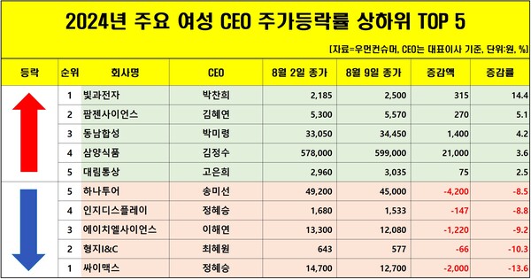 우먼컨슈머 조사, 여성 CEO 재직 상장사 40곳 이달 2일 대비 9일 주가 분석