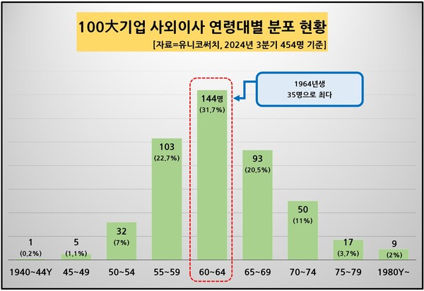글로벌 헤드헌팅 전문기업 유니코써치는 이 같은 내용을 골자로 한 ‘2024년 기준 국내 100대 기업 사외이사 현황 분석’ 결과를 22일 밝혔다. 조사 대상 100대 기업은 상장사 매출(2023년 별도 재무제표 기준) 기준이고, 사외이사 현황은 2024년 3분기 보고서를 참고해 조사가 이뤄졌다. 동일인이 2개 이상 복수 기업에서 사외이사 등으로 활약하는 경우는 회사를 기준으로 별도 인원으로 산정했다.