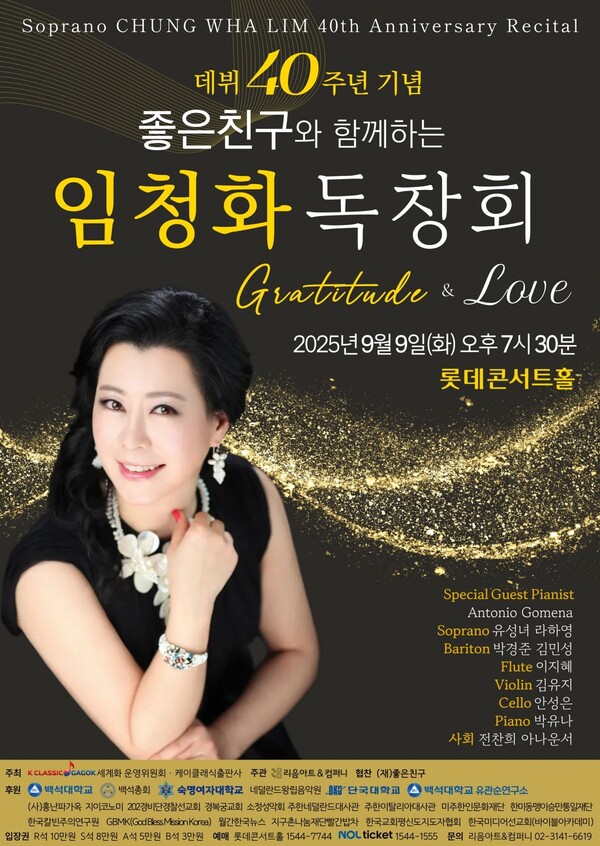 소프라노 임청화(백석대 문화예술학부 교수)가 데뷔 40주년을 맞아 지난 9일 오후 7시 30분 서울 송파구 롯데콘서트홀에서 기념 독창회를 열고 관객들의 뜨거운 환호 속에 성황리에 마무리했다.