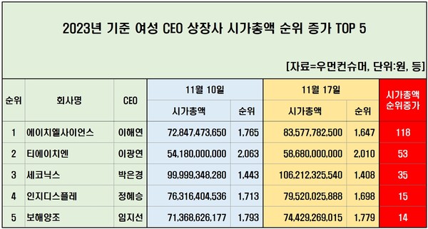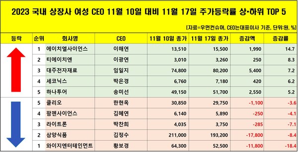 우먼컨슈머 조사, 여성 CEO 40명 이달 10일 대비 17일 주가 변동 조사