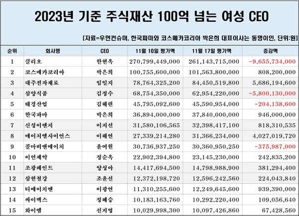 이달 17일 기준으로 주식평가액이 100억원 넘는 여성 CEO는 15명인 것으로 집계됐다. 15명 중 4명을 제외하고 나머지는 주식재산이 모두 불어난 것으로 나타났다.